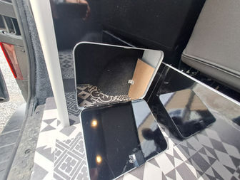 TRAFIC L2 de ROGER: conversion d'une camionnette 2 places en Van 4 places, mise en place d'un toit relevable à levée arrière REIMO, aménagement tout à l'arrière et banquette dinette, mobilier complet haut et bas avec rangements, équipé d'un combiné plaque de cuisson/ gaz CAN, intégration d'un frigo CARBEST 50 litres. Banquette RIB 2 places 94cm modulable en lit 120 x 190, rangements sous le siège. Combiné chauffage / eau chaude carburant TRUMA COMBI diesel, coin sanitaire comprenant douche, toilette DOMETIC avec cassette arrière. Ouverture de 2 baies vitrées, rideaux occultant, citerne 50 litres, citerne eaux usées 30 litres sous le châssis....